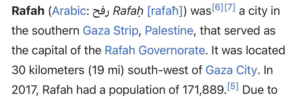 Most notably, the article on Rafah now opens with “Rafah was a city…” and references widespread destruction and changes in control due to the ongoing war. Meanwhile, Al Qarya as Suwaydiya is described as “destroyed in 2024,” and other localities have similar language indicating they “were” places that once existed.