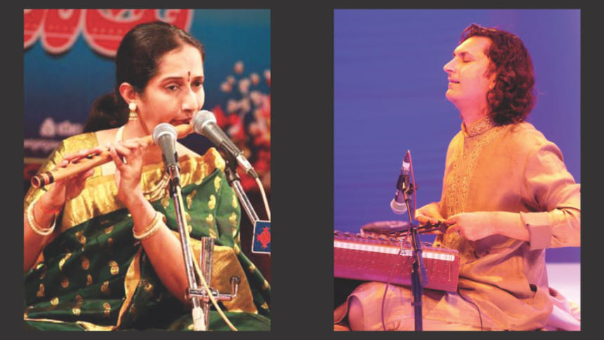 For the first time in the festival, legendary Ustad Zakir Hussain will perform solo, while Carnatic vocalist Padmavibhushan Dr. Balamuralikrishna will present a jugalbandi with Grammy nominated flautist Pt. Rano Majumder. Among other first-time performers, noted flautist Dr. Jayaprada Ramamoorthy, popular khayaliya Shubha Mudgal and Shruti Sadolikar ; Dhrupadiya Wasifuddin Dagar will perform solos, led by legendary 'singing violin of India' N. Rajam, three generation Carnatac violinists will diffuse melody; noted couple Raja and Radha Reddy will showcase Kuchipudi dance; Irshad Khan [son of Ustad Imrat Khan] and Shujaat Khan [son of Ustad Vilayat Khan] with roots in Bangladesh will play Surbahar and sitar respectively; Saraswati Veena will be presented by Jayanthi Kumaresh while Shubhayu Sen Majumdar will debut the esraj.