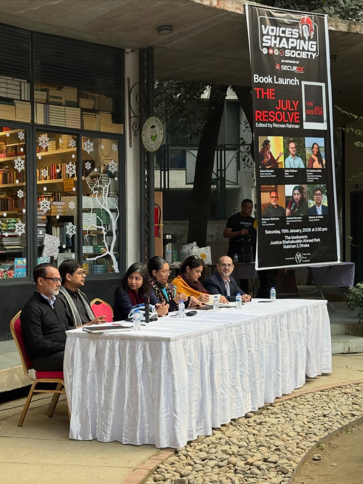 On the chilly afternoon of January 10, Bookworm Bangladesh, in collaboration with Voices Shaping Society, hosted the book launch of The July Resolve, a collection of 36 narratives that depicts the strength and struggles of people from all walks of life during the Monsoon Revolution of 2024. Under the shade of luscious trees, an enthusiastic audience gathered to listen to the thought provoking panel discussion that explored the conception of the book, edited by Rezwan Rahman, Chair of the Advisory Board of It's Humanity Foundation (IHF).