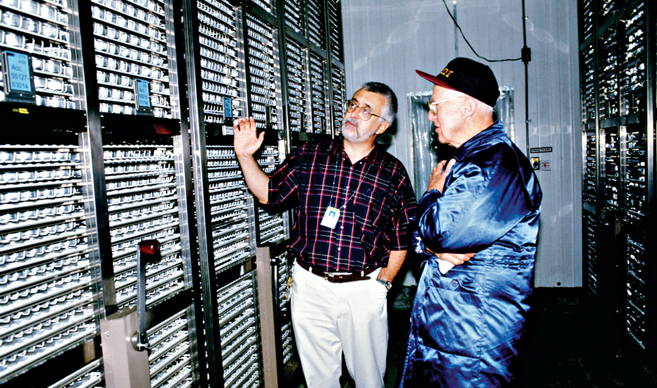 The IRRI gene bank’s first head, Dr Mike Jackson, gives Nobel Laureate Norman Borlaug a tour of the gene bank’s large cold storage facility in 1999. Photo: IRRI