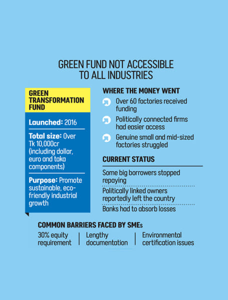 At the same time, some of the country’s most influential and politically connected business groups have had no such trouble accessing the Tk 10,000 crore refinancing fund. Its official name is the Green Transformation Fund (GTF), operated through the Bangladesh Bank (BB).