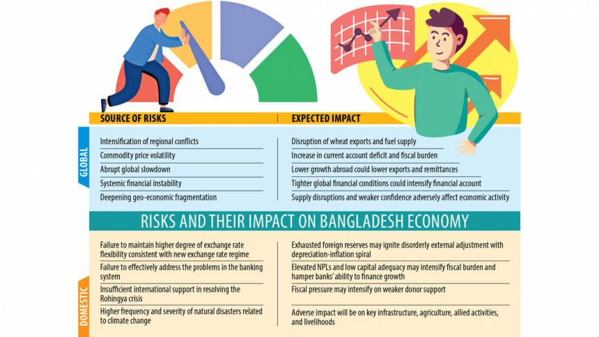 They are intensification of regional conflicts; commodity price volatility; abrupt global slowdown; systemic financial instability; deepening geo-economic fragmentation; failure to maintain exchange rate flexibility; failure to address the problems in the banking system; insufficient international support in resolving the Rohingya crisis; and higher frequency of natural disasters.