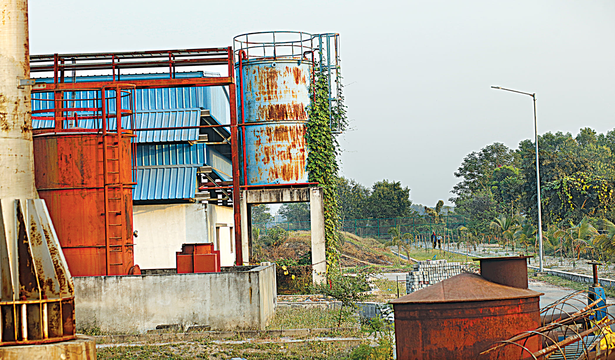 An aerial view of the park’s infrastructure, featuring the Tk 80 crore central effluent treatment plant. Designed to handle hazardous chemical waste for dozens of factories, the facility remains unused and deteriorating.