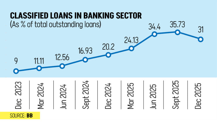 At the end of December 2025, defaulted loans stood at Tk 5,57,217 crore compared with Tk 6,44,515 crore at the end of September, according to the latest data from Bangladesh Bank (BB).