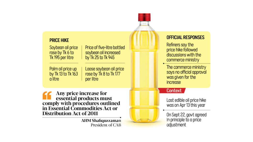The price of a 5-litre bottle of soybean oil has been hiked by Tk 25, or 2.71 percent, to Tk 945, said the association, adding that the new rates have been fixed in consultation with the commerce ministry, in line with international prices.