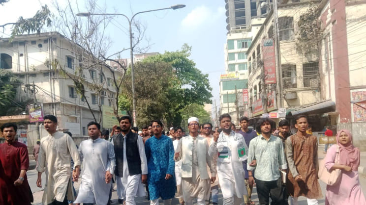 At Jagannath University (JnU), a procession began from the university’s central mosque and marched through Ray Saheb Bazar intersection before concluding with a brief rally at Bishwajit Chattar.