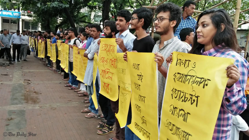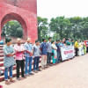 Later, over 60 JU students, including the 54 accused in the case, formed a human chain at the court premises to press home their six-point demand including immediate withdrawal of the case and reformation of the probe body.