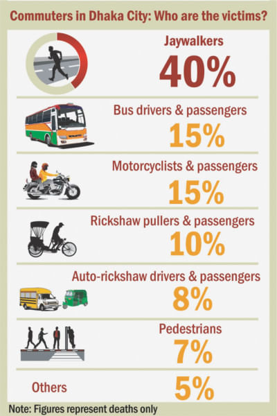 The Daily Star has accumulated accident reports from 2010 to present and found that jaywalkers accounted for 40% of all reported those deaths in the capital city.