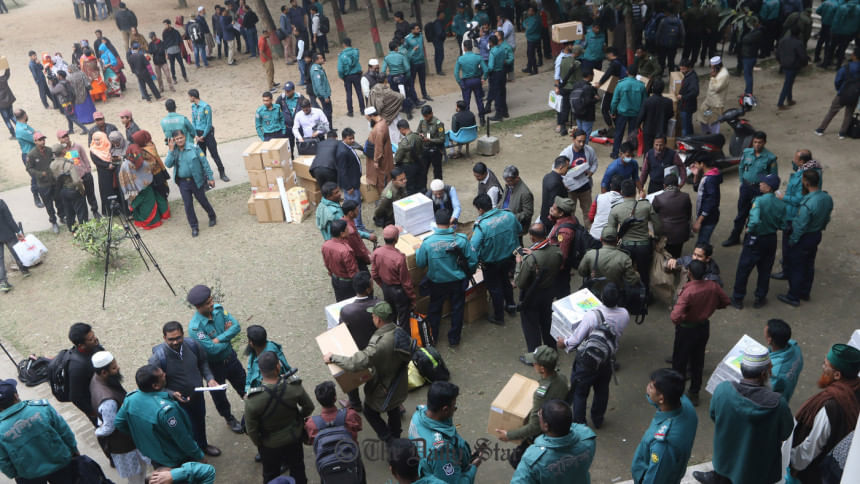 The returning officers handed over the polls materials to the respective presiding officers of the voting centres at Dhaka Residential Model School and College at Mohammadpur and Khilgaon Model College respectively, our photojournalist reports.