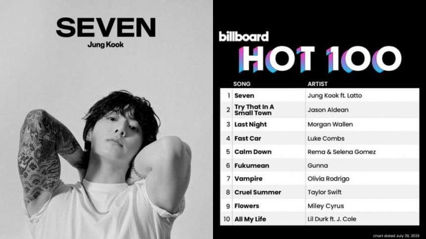 BTS' Jung Kook's "Seven," featuring Latto, takes the No 1 spot on the Billboard Hot 100 Songs chart. This triumph makes Jung Kook the second member of BTS to lead the chart, following Jimin's "Like Crazy," which debuted at No. 1 in April.
