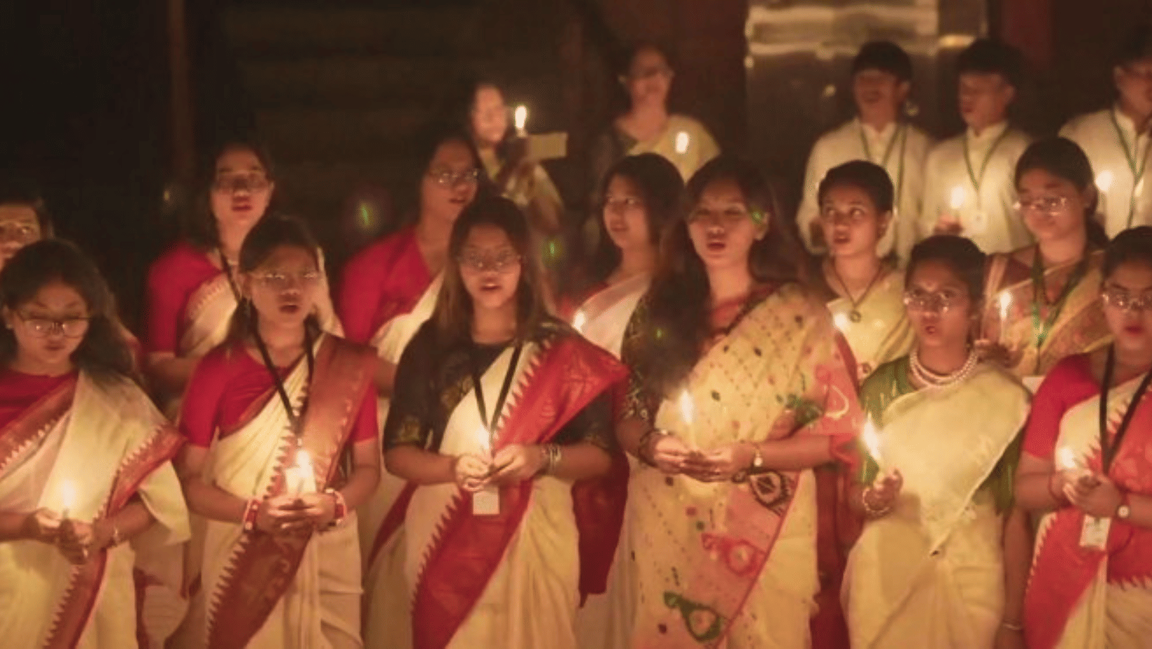 Holding candles in their hands, the performers raised their voices in unison, presenting a series of timeless songs including “O Alor Pothojatri”, “Nahi Bhoy Nahi Bhoy”, “Dukkhe Amar Poran Kande”, and “Aguner Poroshmoni”.