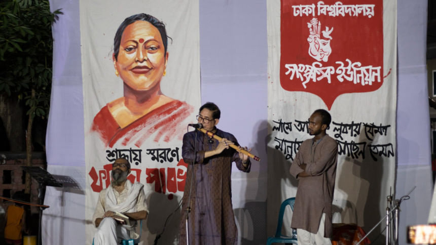 The show began at 5 pm, with students taking the stage to tune their flute, kartal (metal cymbals), dotara, and dhol. Her influence permeated every speech and performance as current students reflected on growing up with her music, their voices heavy with grief. Ahmed Abrar of DU's 103rd batch opened the evening with "Khachar Bhetor Ochin Pakhi" — (Look, how a strange bird flits in and out of the cage!)