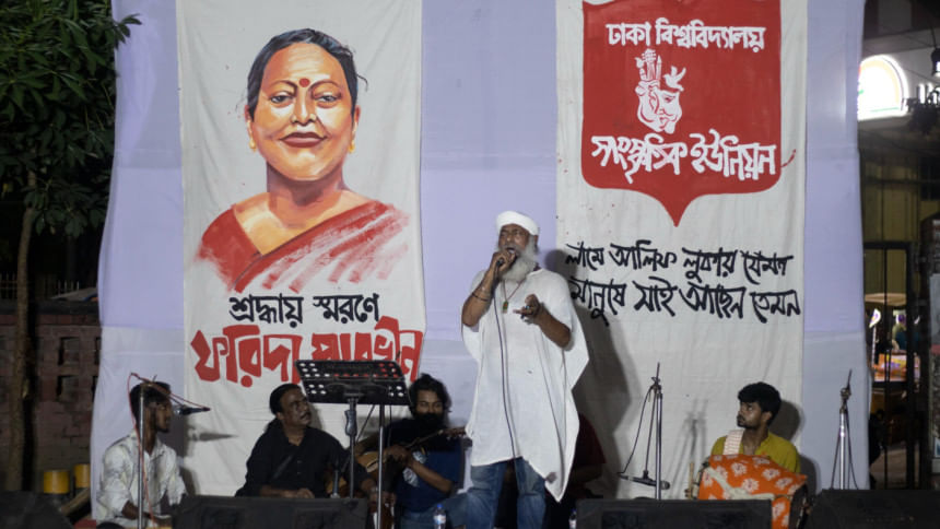 Farida Parveen, the renowned contemporary vocalist whose name is almost synonymous with Lalon sangeet, passed away on the 13th of this month after a prolonged illness. In a commemorative evening titled "Sroddhay Smarane Farida Parveen", held on September 25, the Dhaka University Cultural Union arranged a heartfelt tribute filled with soulful voices that echoed through the open air of TSC as people from all walks of life listened in awe and quiet remembrance.