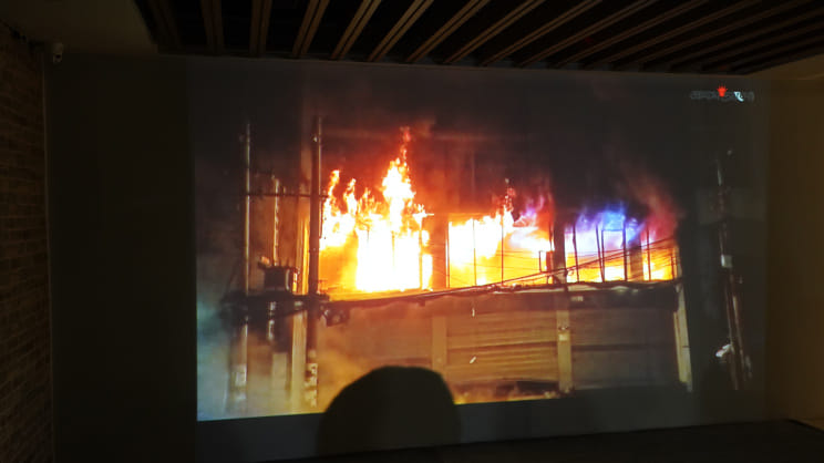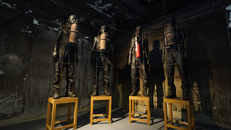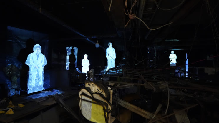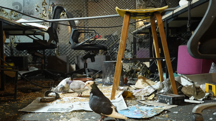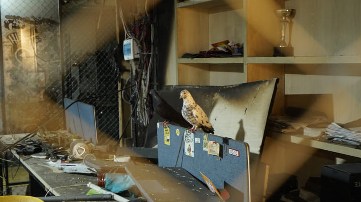 In one installation, pigeons move freely across a fire-damaged floor, navigating desks and scattered remnants. Their presence suggests continuity amid disruption, a living counterpoint to destruction.