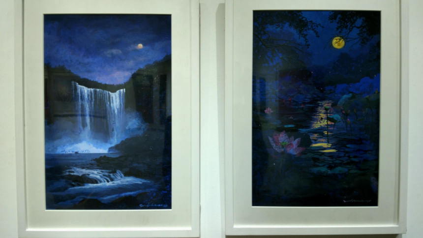 As I stepped into the gallery, I was instantly enveloped by the soul-stirring presence of the artworks around me. As someone endlessly drawn to dark, cool-toned hues, I found my heart stolen by Maneek Banik's mesmerizing paintings of moonlit nature at night. In contrast, Monjur Rashid's signature canvases burst with vibrant colours, portraying cheerful scenes of birds and flowers that seemed to hum with life. Meanwhile, Biplob Chakraborty's pieces stood apart with their distinctive, Picasso-esque interpretations of rural landscapes; bold, abstract, and profoundly expressive.