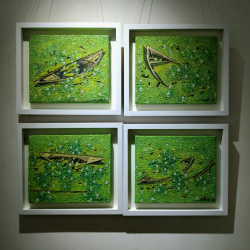 Soikat Hossain's boats under the moonlight brought to mind Tagore's poem "Majhi" (The Boatman), while his paintings of boats resting in yellowish-green duckweed – textured with such charm – made me giggle with joy. Nabaraj Roy's abstract cityscapes, rendered in earthy tones and deep blues, beautifully captured the rhythm of urban life. The subtlety and translucent beauty of watercolour are beautifully reflected in Anamuz Zahid's paintings. Meanwhile, Nargis Poly's symbolic art, with its futuristic touch and occasional glitters, is both thought-provoking and neat.