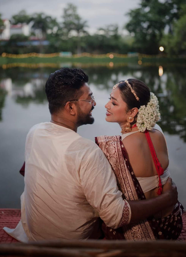 The bride is seen decked out in a maroon Banarasi saree, while the groom is dressed in a white panjabi. Although the couple kept the ceremony intimate, they did not shy away from wearing traditional attire for the occasion.