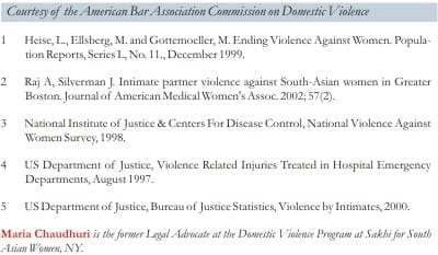As long as men and women have unequal rights in society, the problem will continue. "After all, whether it is class, caste, race or gender -- those who have the power frequently define the way things should be, oppress, and have interest in maintaining the status quo," says Abraham. Permanent change will be thus initiated when we start to re-define the role of women in our culture, and negate marriage as the fulcrum of a woman's adult life. If nothing else, let numbers speak the truth. Approximately 1.5 million women are physically assaulted by an intimate partner in the United States, annually. Since many women experience multiple victimizations every year, an estimated 5.9 million physical assaults are perpetrated against US women annually.3 In the US, thirty-seven percent of women who sought treatment in emergency rooms for violence-related injuries in 1994 were injured by a current or former spouse, boyfriend or girlfriend.4 Each day, more than three women in the United States are murdered by a male intimate partner.5 It is imperative to take these figures seriously, and to protect our daughters, sisters and friends from entering into relationships that can cost their lives. Under all circumstances, do not fail to investigate a foreign proposal exhaustively, and do not turn away should the marriage turn abusive. Each one of us can help -- start now by breaking the silence. For specific information on domestic violence please visit www.sakhi.org |
