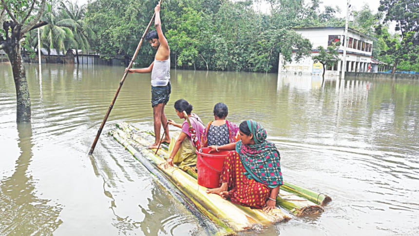 Houses and crop fields in Dimla and Jaldhaka upazilas in Nilphamari went under about six-foot water as thousands moved to the Teesta embankment and schools and colleges.