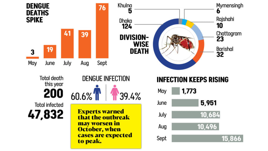 According to the Directorate General of Health Services (DGHS), in September alone, 76 people died from the disease and 15,866 patients were hospitalised -- the highest monthly toll this year.