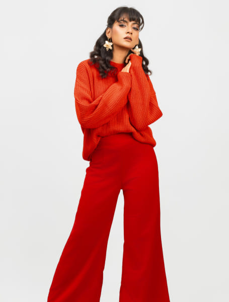 In terms of styling, coords in solid colours make quite a statement on its own, so minimal accessories are enough. A simple pair of golden earrings or a chunky bangle in a contrasting colour is all you need. Shoes and bags should also be in neutral tones to let the sweater set truly shine this winter!