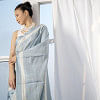 Lightweight weaves like muslin, cotton silk, and khadi are the go-to choices. Sarees in solid colours like ivory, lemon yellow, and pale peach look striking and serene when styled with contrasting blouses or even a crisp crop shirt for a modern spin.