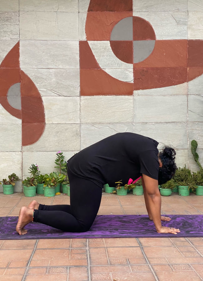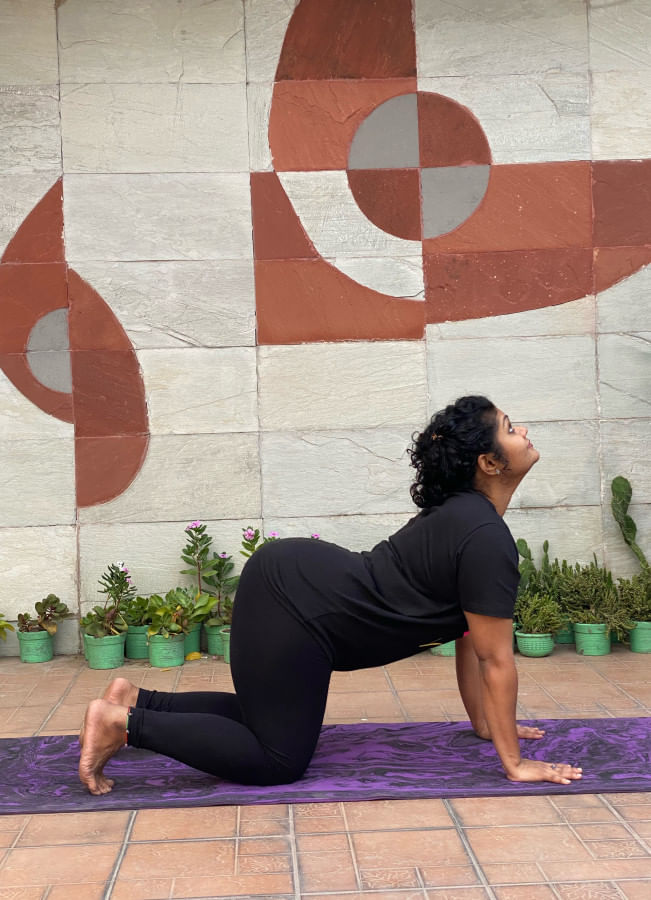 As the belly grows, balance naturally changes. Practising near a wall or using a chair for support keeps movement steady and safe.