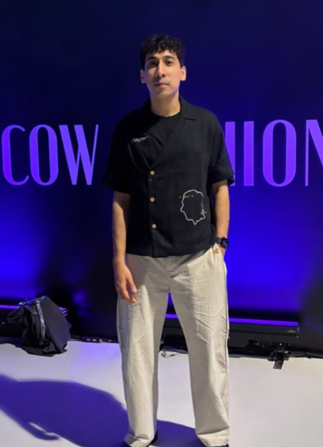 Presenting his label Ami Dhaka, Sattar described its design language as Heritage Futurism—Bangladeshi artisan techniques reimagined for modern life. Each piece is handmade with deliberate care; at minimum, even the size label is hand-stitched as a nod to slow, conscious craft. He wore unreleased Ami Dhaka pieces during Moscow Fashion Week: