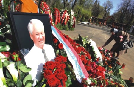 A woman lays flowers at the grave of former Russian president Boris Yeltsin at Novodevichie cemetery in Moscow. Russia bid a solemn farewell to Boris Yeltsin, its first post-Soviet leader, in a funeral presided over by some two dozen white-robed priests, with a crowd of dignitaries including President Vladimir Putin and two former US leaders in attendance. AFP PHOTO / VIKTOR DRACHEV |