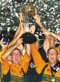 | Australia cricket captain Ricky Ponting (L) and Man of the Match Adam Gilchrist (R) hold up the trophy as they celebrate their victory. |