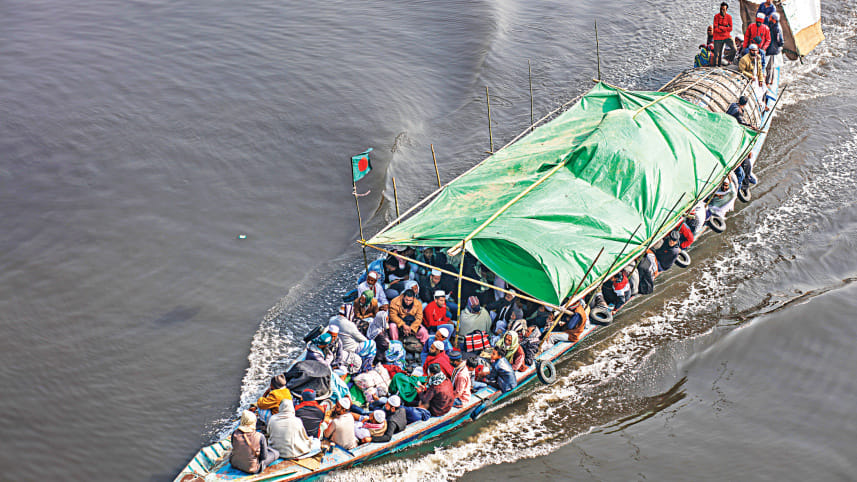 With the Biswa Ijtema just a day away, devotees from Dhaka and its adjacent districts have started pouring into the Ijtema ground in Tongi. This picture taken yesterday near the capital’s Basila bridge shows a boat carrying devotees in the Turag river. The first phase of the Ijtema will be held on January 13-15. Photo: Rashed Shumon