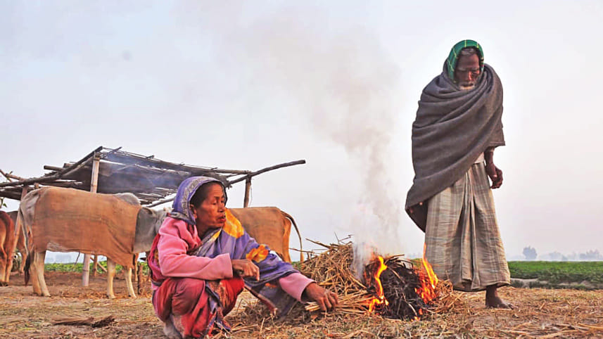 An elderly couple seeks warmth from a fire they lit using straws and hay in Salapak village of Rangpur’s Gangachara upazila. With the cold ripping through the northern districts, people from low-income families usually turn to fire to stay warm yesterday. However, this has already caused major accidents in at least eight districts, as many people have had to suffer serious burns. Two women have recently succumbed to such injuries in Rangpur Medical College Hospital. PHOTO: KONGKON KARMAKER