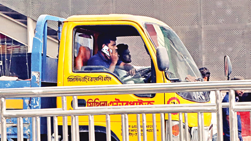 A pickup truck driver on his mobile phone while driving in the capital’s Shewrapara, completely oblivious to the danger he is posing to himself, other vehicles and pedestrians. Though the Road Transport Act-2018 made it a punishable offence, this kind of irresponsible behaviour goes unabated as the authorities concerned hardly take action. According to the law, the punishment for using mobile phones while driving is maximum one month of imprisonment or a fine of Tk 5,000 or both. The photo was taken yesterday. PHOTO: PRABIR DAS