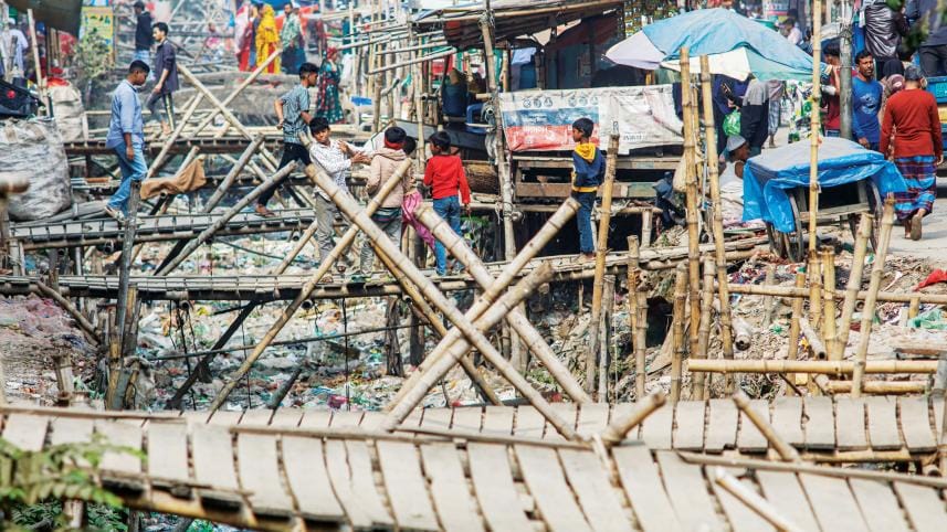 Locals in the capital’s Jatrabari have built wooden and bamboo bridges in close proximity to each other over Kajla Khal, a canal that serves as a drainage system for the area. Residents of the nearby neighbourhoods often experience water logging in monsoon because the canal remains partially clogged. Photo: Rashed Shumon