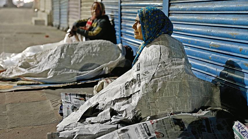 Two elderly women wrapped themselves in with plastic sacks and old newspapers to shield themselves from the cold around 1:00am yesterday, when the temperature was 14 degrees Celsius. Like them, many living on the footpaths of the capital’s Shantinagar wait all day under the open sky for donated food or warm clothes. PHOTO: ANISUR RAHMAN