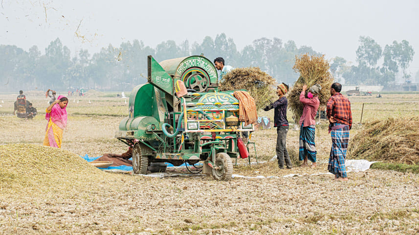 Farmers of Bogura’s Dhunat upazila using a thresher to separate mustard seeds from the recently harvested plants. Once all the mustard crops are threshed, the field will be prepared for Boro farming as its season nears. The photo was taken recently. PHOTO: MOSTAFA SHABUJ