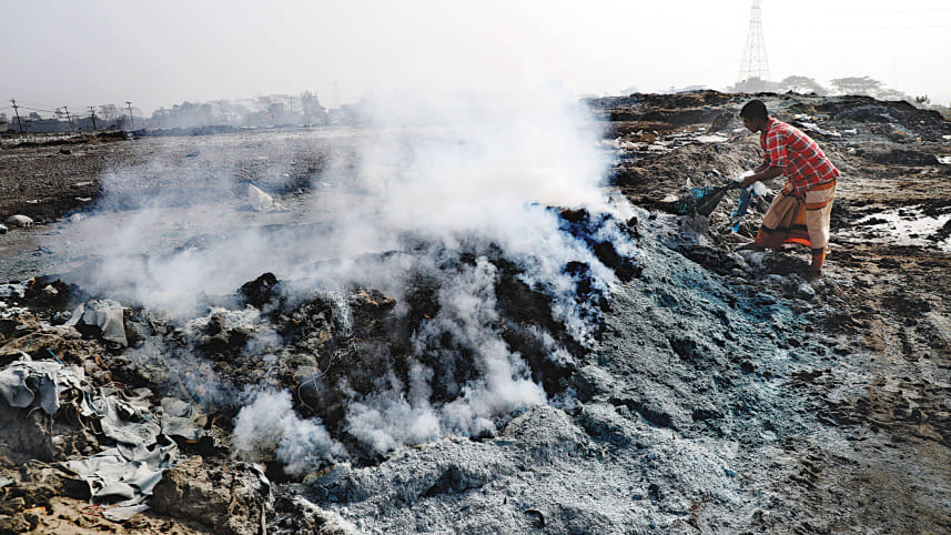 Solid waste, mostly bits of scrap leather, being burned right outside the Savar Tannery Industrial Estate. Dumping of chemically treated waste harms the soil and burning the waste pollutes the air. The photo was taken recently. Photo: Palash Khan