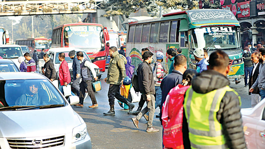 People crossing the busy road near Hazrat Shahjala International Airport without using the footbridge just a few feet away. Such ignorant behaviour by pedestrians often results in road accidents. The photo was taken yesterday. PHOTO: PRABIR DAS