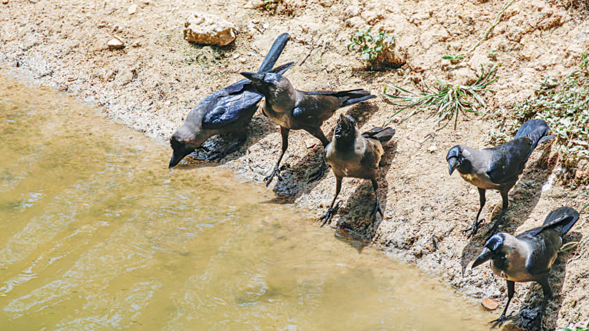 As the mercury climbs and the sun beats down mercilessly, crows in the capital’s Ramna Park quench their thirst by drinking from the lake. The photo was taken around noon yesterday. Photo: Rashed Shumon