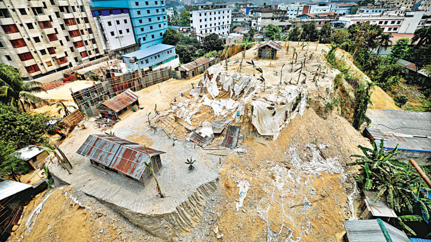 Nagin Pahar was once a prominent and large hill in Chattogram city’s Bayezid area, but years of hill cutting by local influentials has reduced it to its current height -- lower than the fifth-floor window from which this photo was taken on Wednesday. In its original form, it spanned the area now occupied by residential buildings. Efforts are underway to erase the remains of the hill that was once a landmark of the port city. Photo: Rajib Raihan
