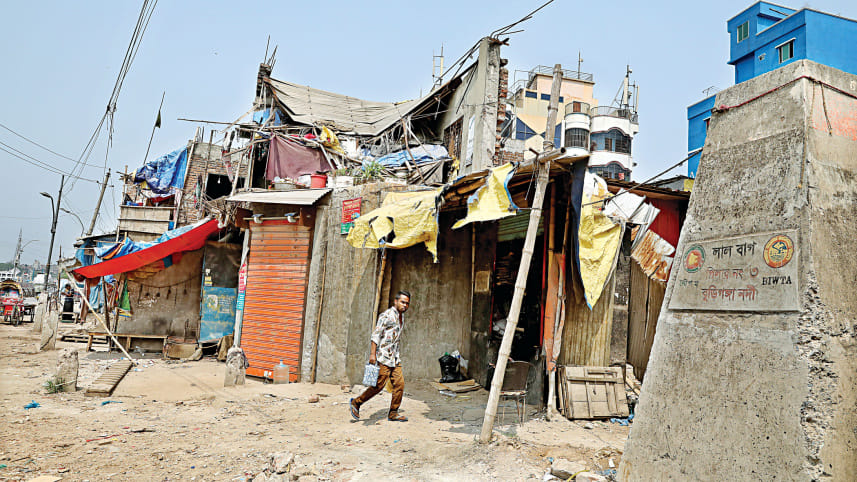 Dilapidated structures line the stretch of land along this demarcation pillar of the Buriganga at Imamganj in Old Dhaka’s Lalbagh. BIWTA last year conducted a drive to demolish the illegal structures that had encroached on the river, but left it unfinished. Soon, the partially demolished structures were refitted, and the scrap shops and plastic recycling workshops began running again. The workers of these shops also live on top of these shaky constructions. The photo was taken on Thursday. Photo: Anisur Rahman