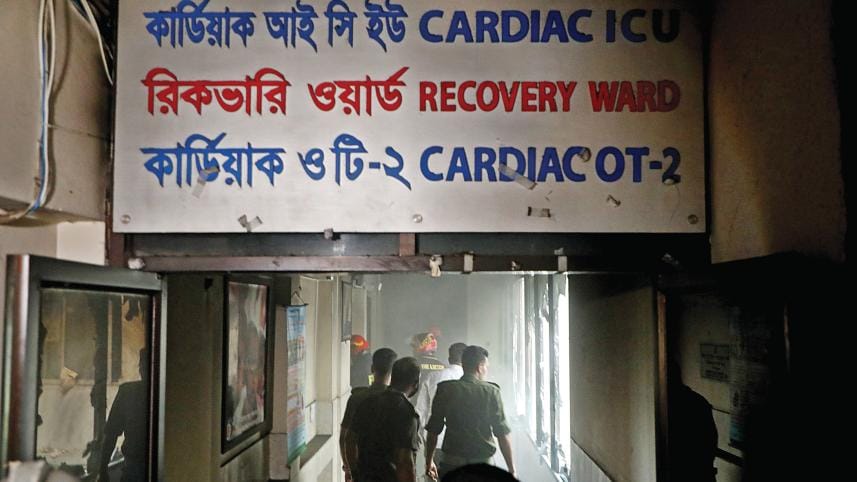 fire service officials and the hospital’s security staffers inspecting the damage after the fire was doused. Photo: Prabir Das