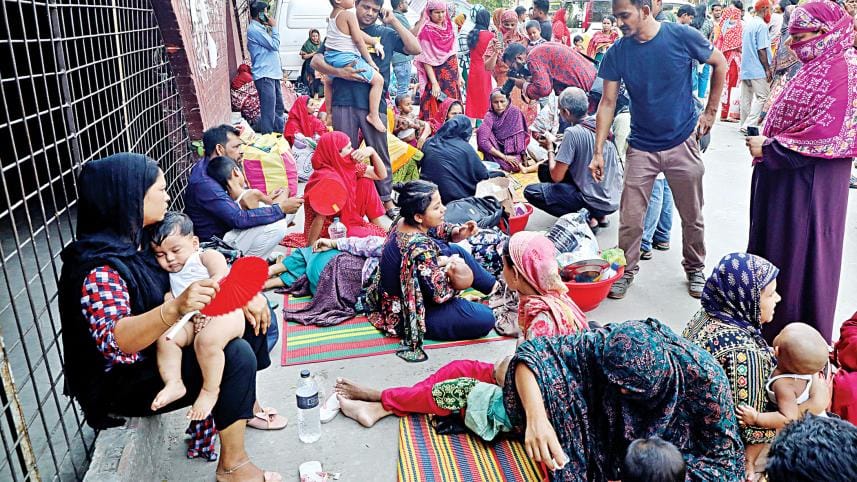 Parents and attendants along with child patients sitting outside Shishu Hospital in the capital yesterday afternoon. A fire broke out in the Cardiac ICU around 1:45pm, following which people left the wards of the children’s hospital. Photo: Prabir Das
