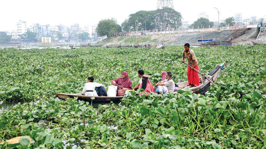 A boatman struggles to navigate through the thick water hyacinths clogging the entrance to the Buriganga Adi (old) channel. Despite the inconvenience, many residents of Kamrangirchar and Zinzira choose the boat ride from Old Dhaka as it is cheaper than road travel. The photo was taken in Dhaka’s Islambagh yesterday. Photo: Palash Khan
