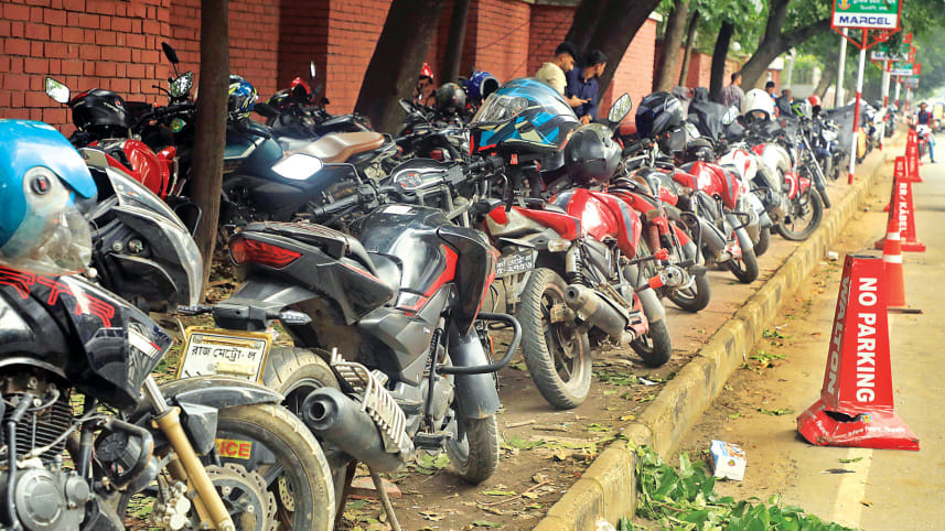 Under the very noses of the guardians of the law, motorcycles are parked on a pavement next to rows of “no parking” cones in front of the Detective Branch office on Minto Road in the capital yesterday. Photo: Amran Hossain