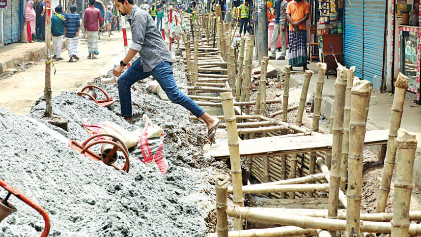 A man crosses a trench dug for installing underground power lines at Tikkapara in the capital’s Mohammadpur. Locals said the work has been going on for around 25 days. The photo was taken yesterday. Photo: Prabir Das