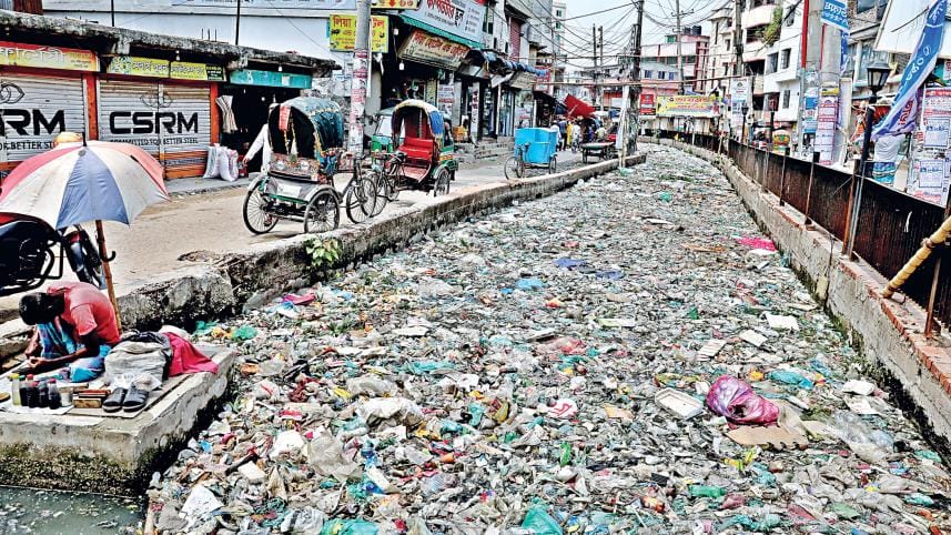 Waste covers this canal as far as the eye can see, while one cobbler has set up shop right next to it. The putrid stench leaves locals suffocating, forcing them to keep their doors and windows shut to avoid the smell. Lack of waste management continues to be an issue that has a chokehold on the city. The photo was taken at Kutubkhali South Jatrabari area yesterday. Photo: Anisur Rahman
