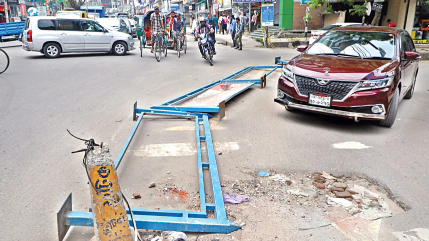 This make-shift divider set up near Adabar Police Station has fallen over and left in this state for a long time, hindering traffic movement on the road. The photo was taken yesterday. Photo: Prabir Das