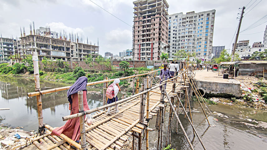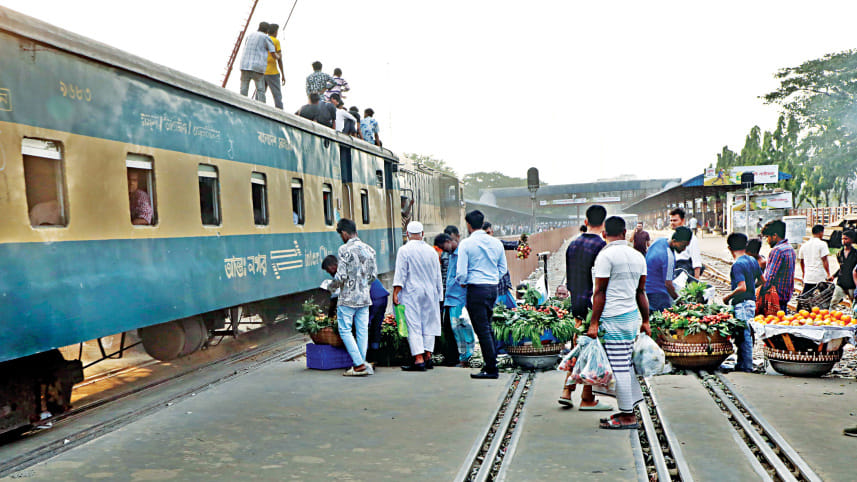 A train whizzes past fruit sellers who have placed themselves right on the lines near the Airport Railway Station, putting not only themselves but also their customers at risk. Multiple trains frequently pass through the station, opposite the Hazrat Shahjalal International Airport in the capital. The photo was taken yesterday. Photo: Rashed Shumon