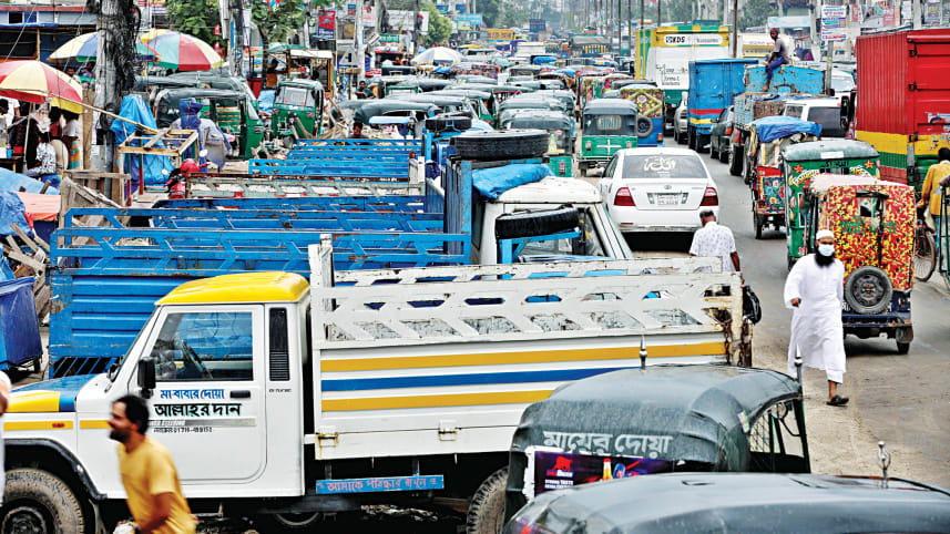 Lines of illegally parked CNGs and pickups have reduced the Padmar Mor Road in Hemayetpur to half its width, while also hogging space on the adjacent footpath, hampering both pedestrian and vehicular movement. The photo was taken yesterday. PHOTO: PRABIR DAS